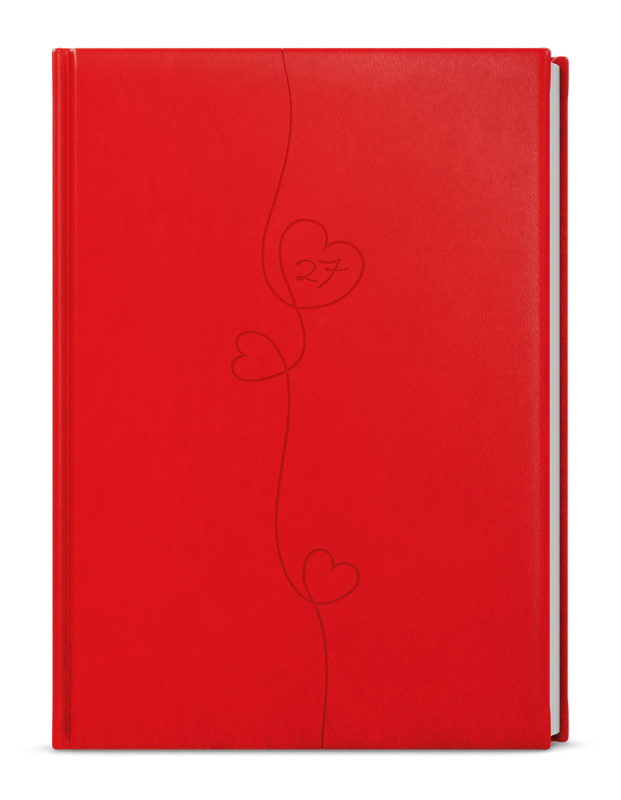 Červený týdenní diář vyráběný z jemné hladké vivelly s efektní ražbou motivu Srdce. Formát A5 je vhodný do tašky a má velký prostor pro poznámky a plánování.