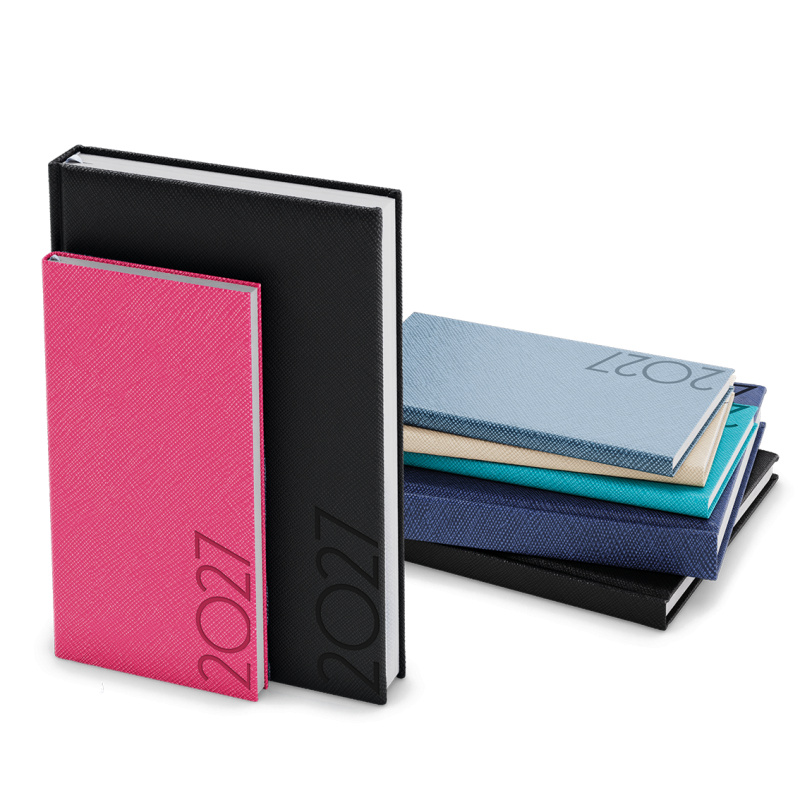 Diář s týdenním kalendáriem na jedné straně a na druhé straně s prostorem na poznámky. Desky jsou vyrobeny ze strukturovaného lesklého materiálu s jednostrannou pěnovou výplní a s kulatými rohy.