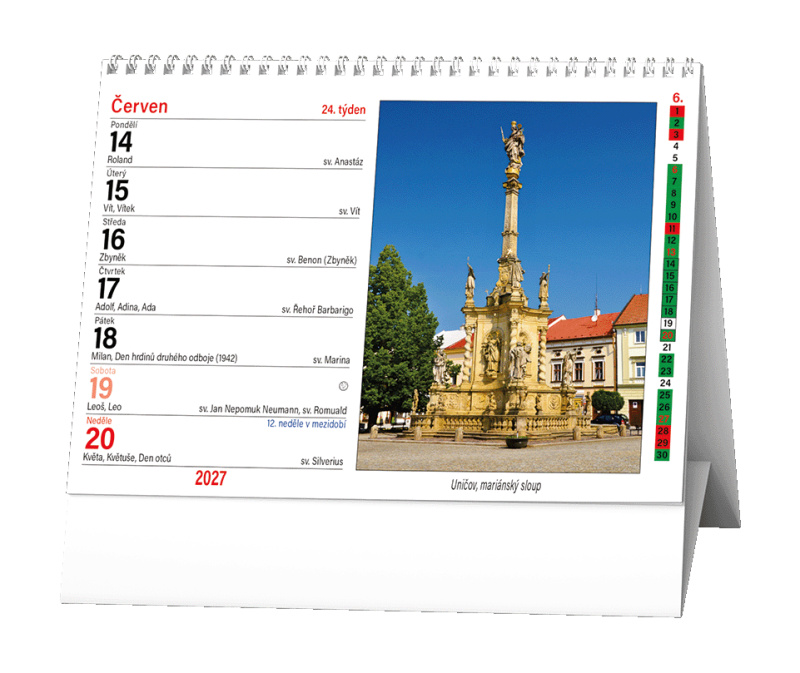 Stolní kalendář s týdenním katolickým a občanským kalendáriem s obrázky kostelů a kapliček.