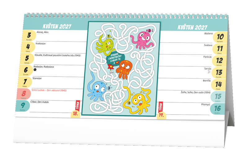 Stolní kalendář s týdenním kalendáriem, při kterém se žádné dítě nenudí - s obrázky, úkoly a bludišti.